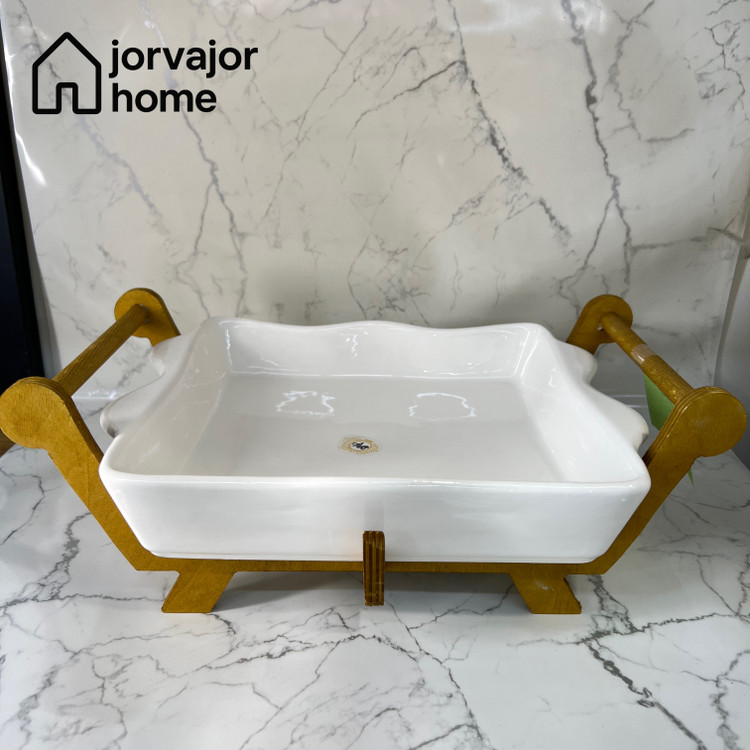 ظرف پذیرایی سرامیکی با پایه و دسته چوب راش
