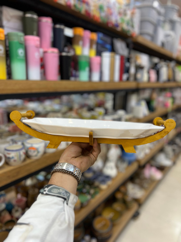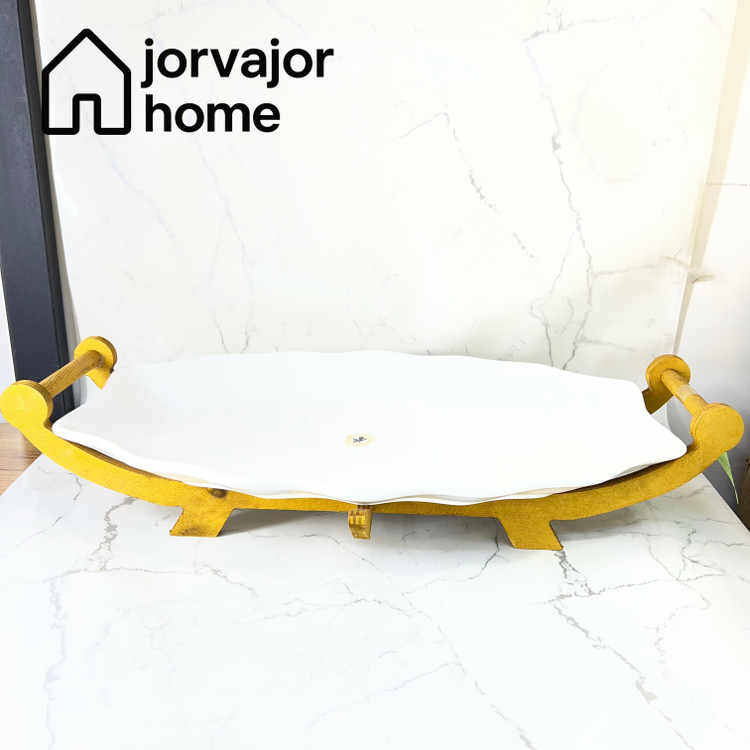 ظرف پذیرایی سرامیکی با پایه و دسته چوب راش
