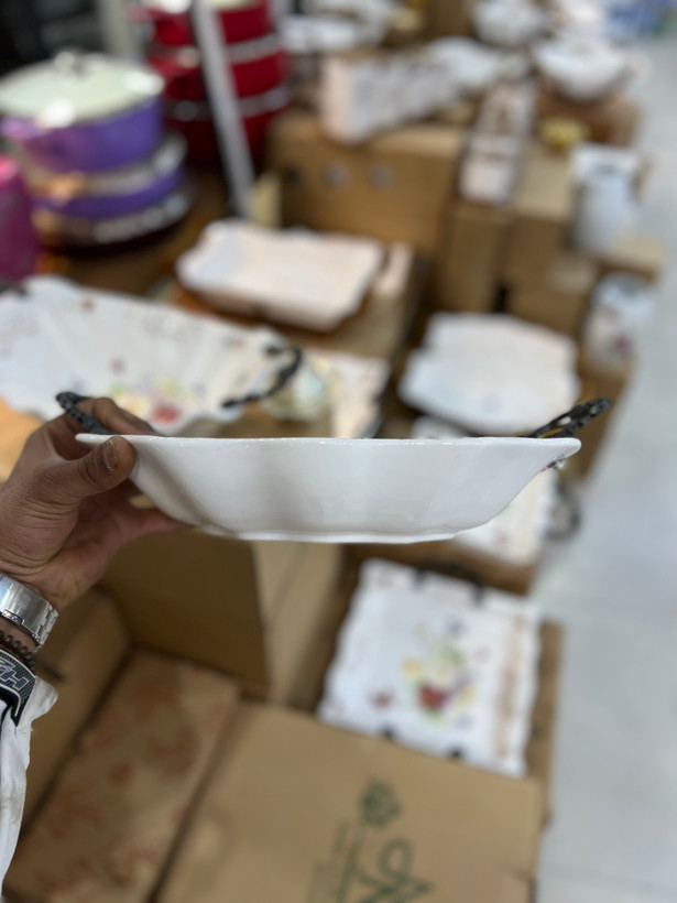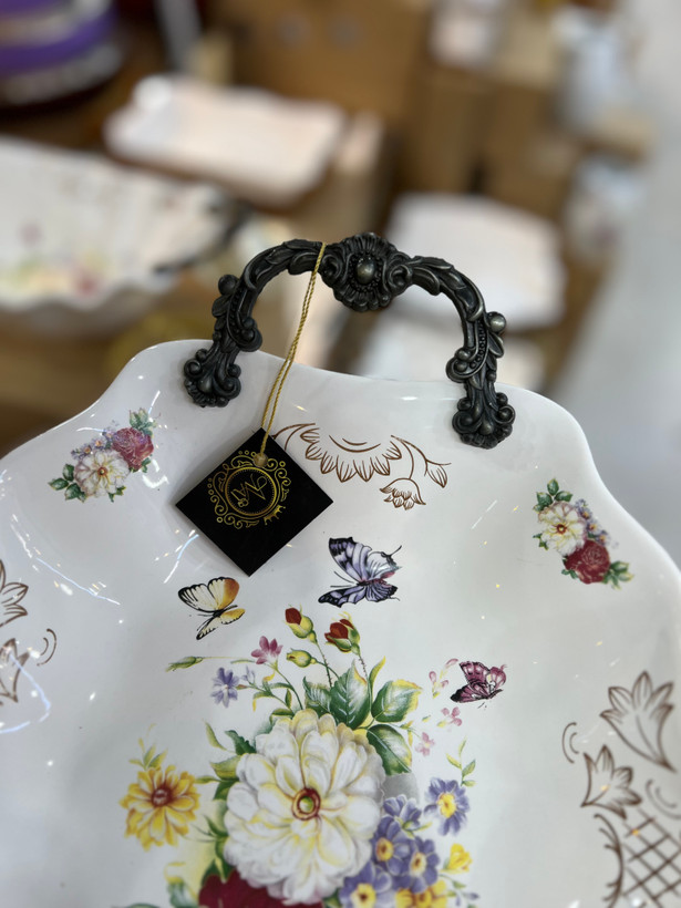 میوه خوری و اجیل خوری دسته دار بیضی مارک انایی قابل شستشو در ماشین ظرفشویی طرح کل سرخی با پخت کوره ای و رنگ ثابت با جعبه شیک مناسب هدیه و کادو