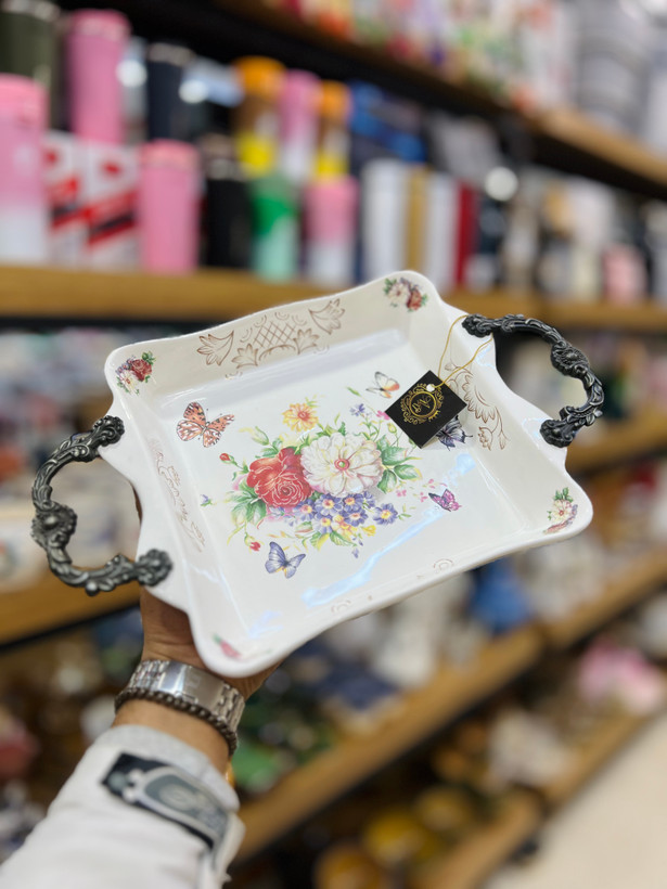 شیرینی /میوه خوری سرامیک دسته فلزی گلسرخی