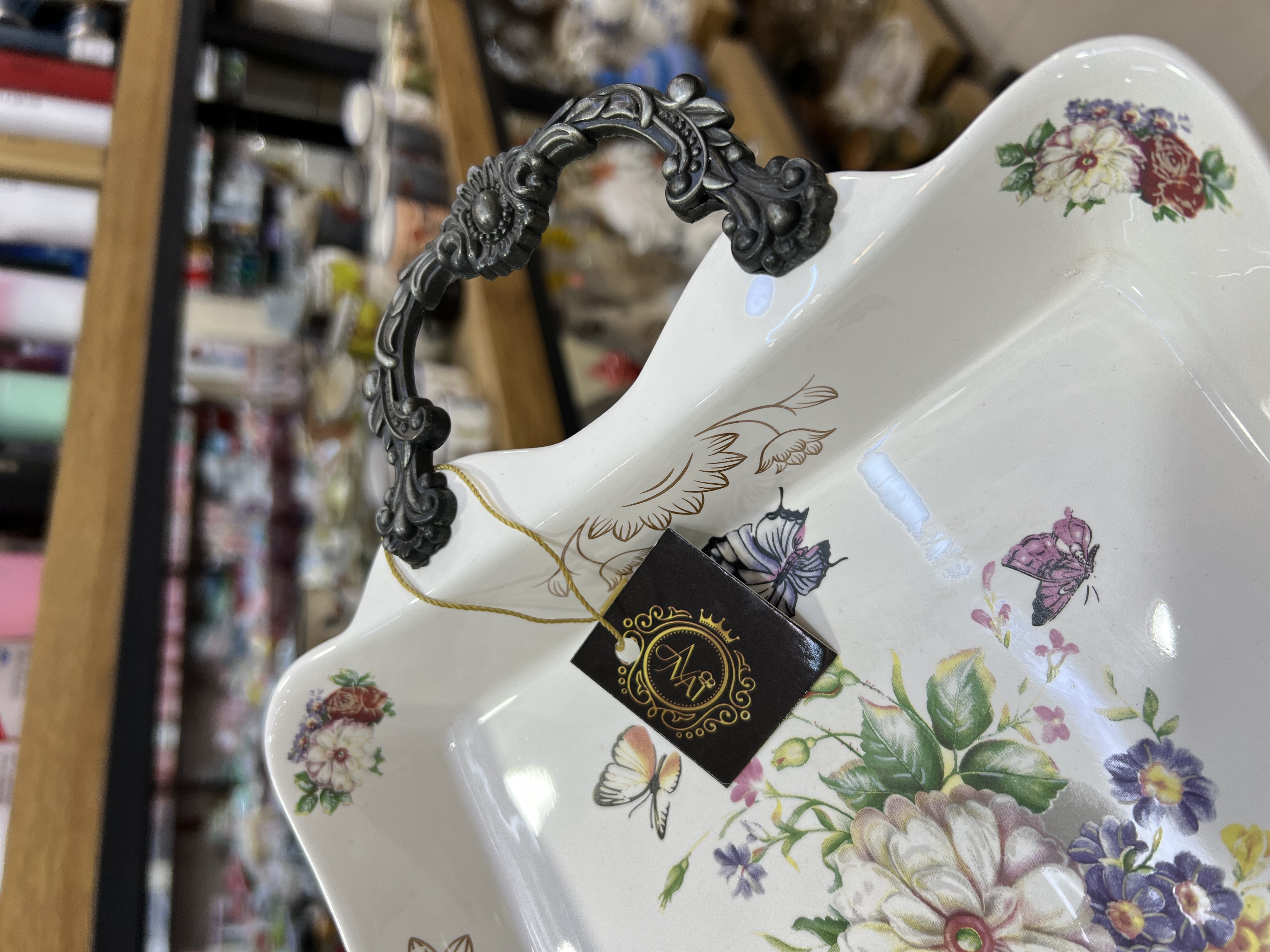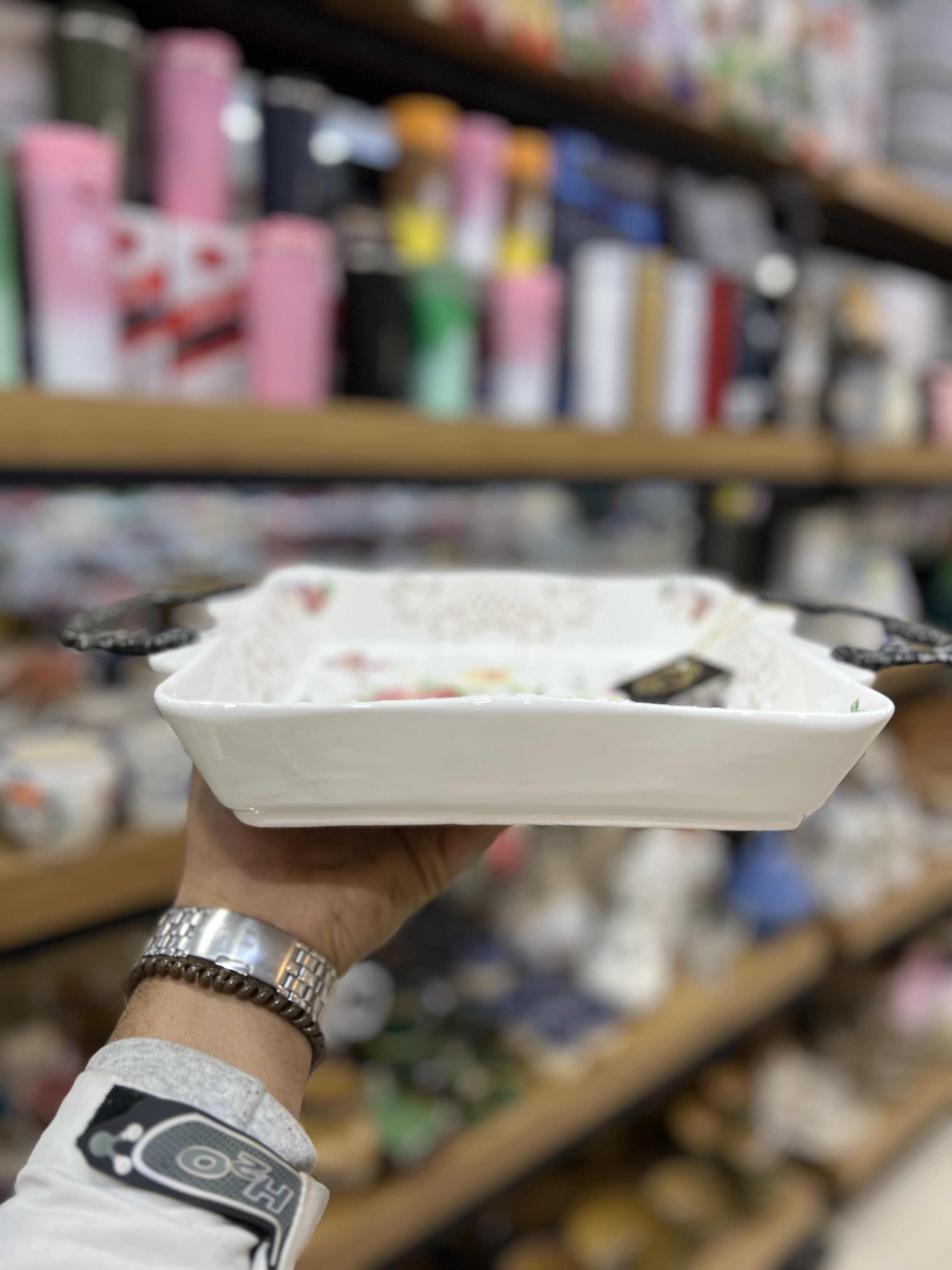 شیرینی /میوه خوری سرامیک دسته فلزی گلسرخی